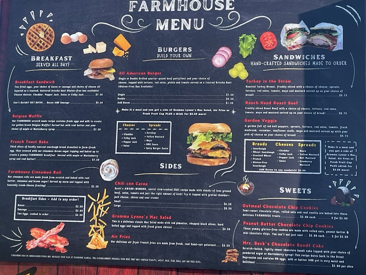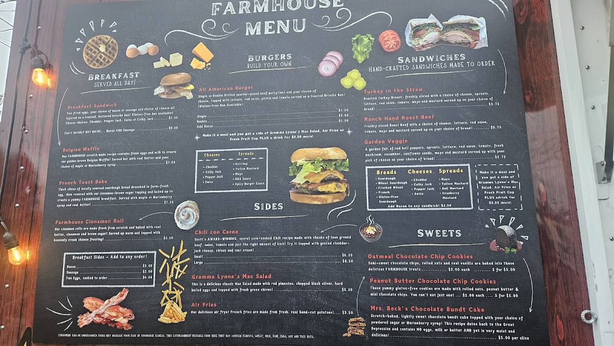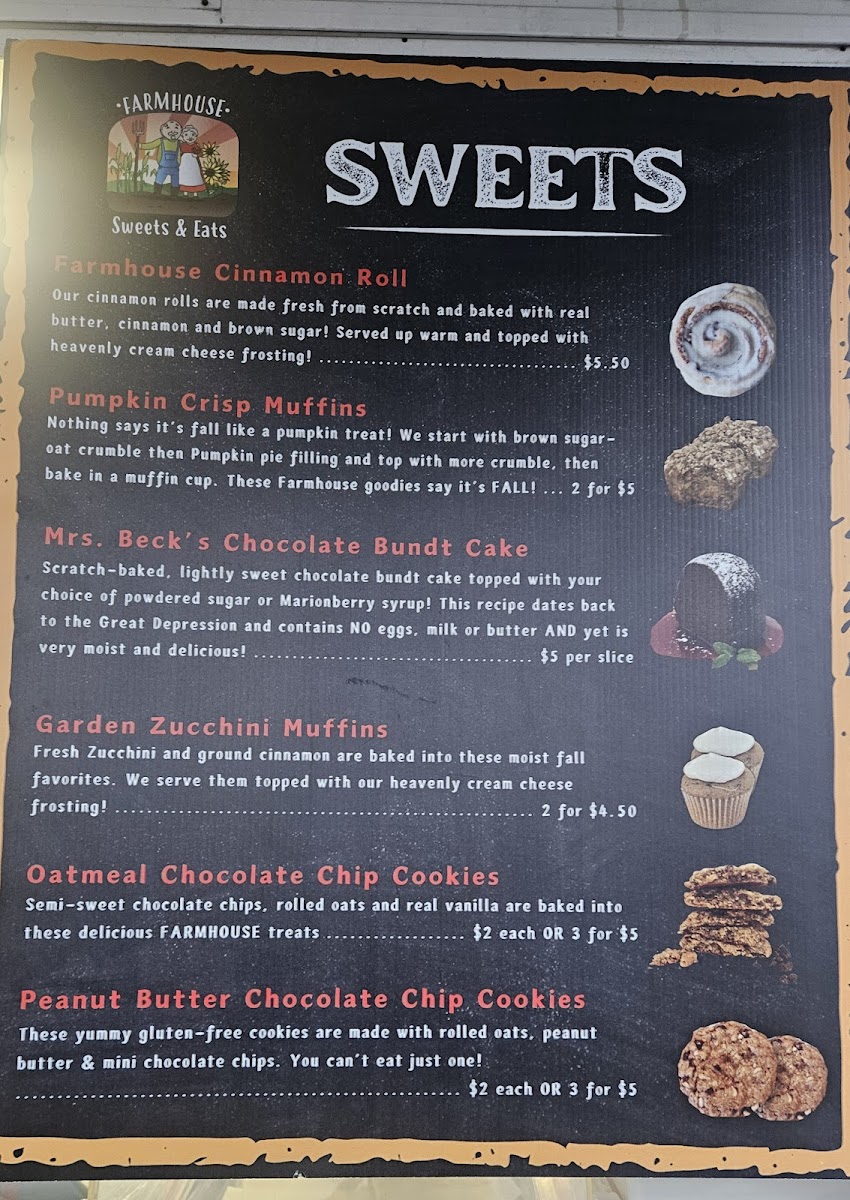 Sides at Farmhouse Sweets And Eats are equally comforting, with Gramma Lynne’s Mac Salad offering a creamy, nostalgic flavor that pairs wonderfully with any of the main dishes. Air Fries, crispy and golden, are a perfect accompaniment to any meal. The menu also includes a selection of hearty, filling options such as the All American Burger, a classic favorite, and the savory Pumpkin Crisp Muffins and Garden Zucchini Muffins that are ideal for a light snack or side.