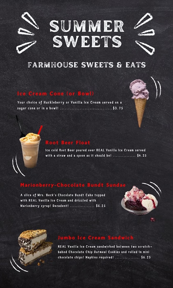 For those with a sweet tooth, the dessert offerings at Farmhouse Sweets And Eats are truly special. Indulge in their homemade Oatmeal Chocolate Chip Cookies or Peanut Butter Chocolate Chip Cookies, both of which are perfectly baked to satisfy cravings for something sweet and chewy. Mrs. Beck’s Chocolate Bundt Cake is another highlight, offering a rich, moist dessert that’s hard to resist. And for a fun twist, their Marionberry-Chocolate Bundt Sundae is a perfect fusion of fruity and chocolatey goodness. Don't forget to try an Ice Cream Cone to complete your meal, offering a cool and creamy finish.